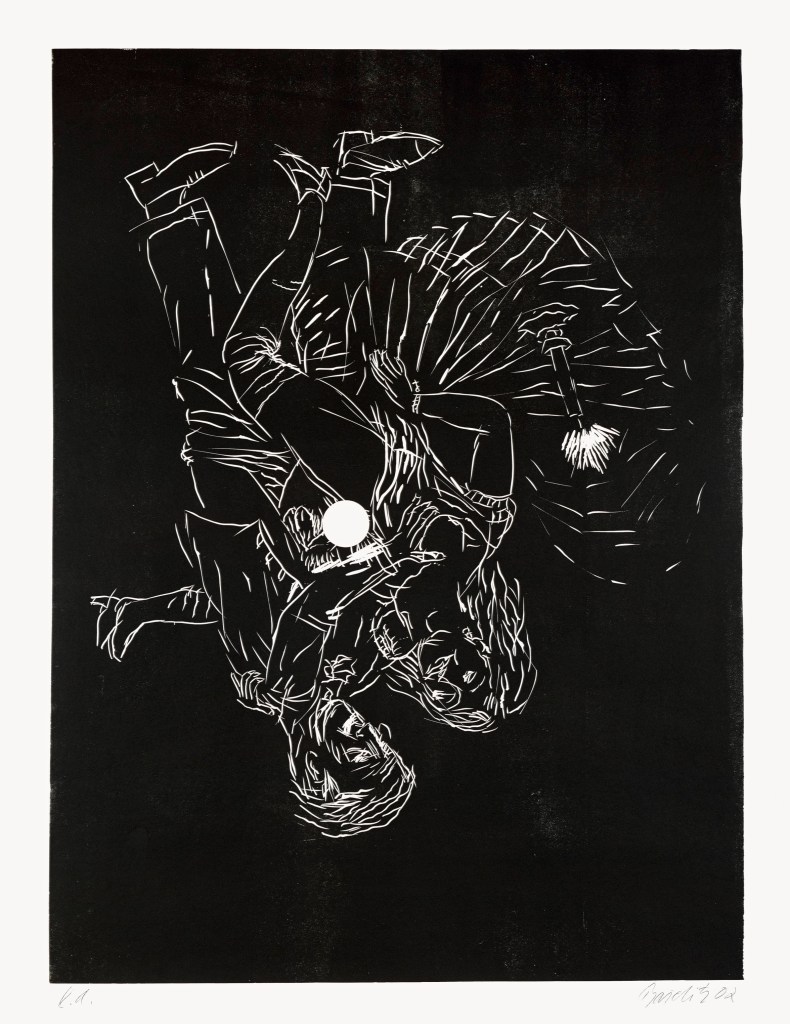 Georg Baselitz; La nuit mit Marie, 2002 Linocut. Paper and Image: 228.0 x 170.0 cm. Edition of 6. Courtesy Georg Baselitz Archive and Cristea Roberts Gallery, London © Georg Baselitz Photo: Manfred Mahn.