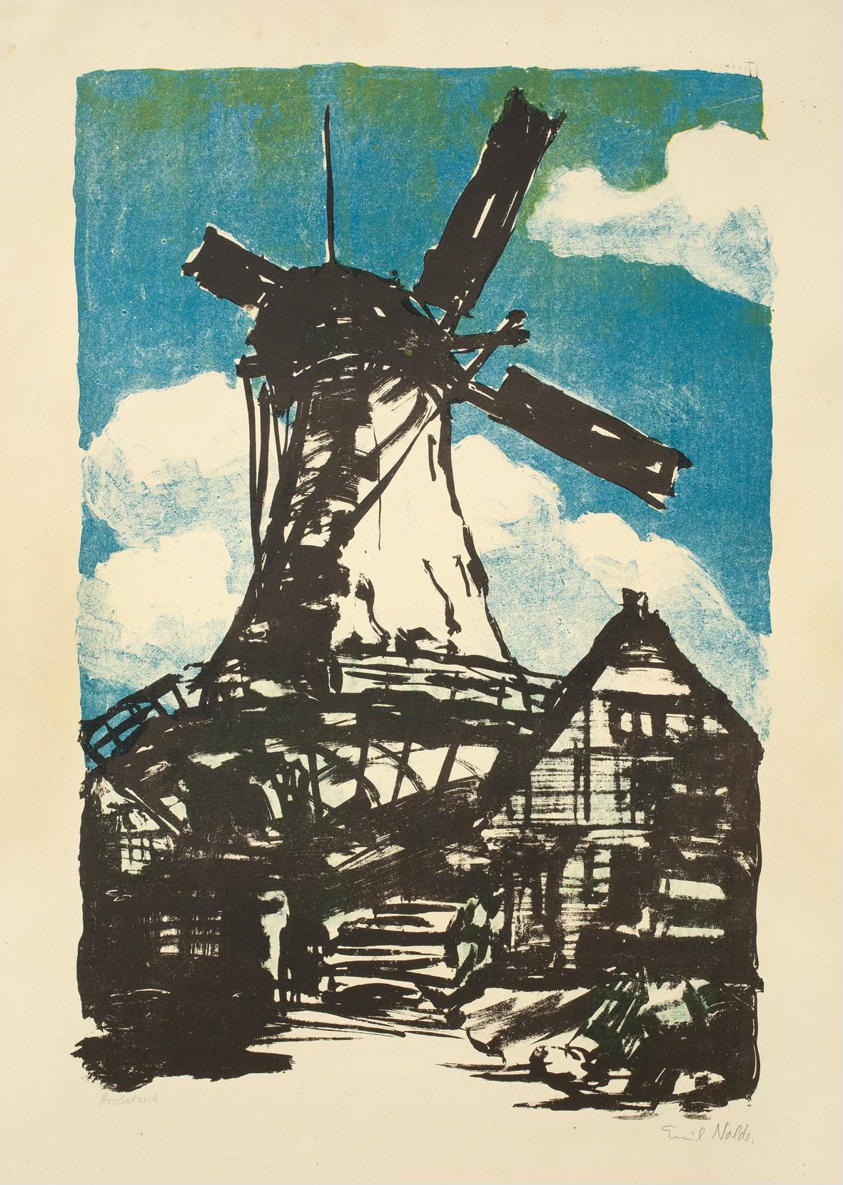 Emil Nolde, Great Mill, 1907/1915. Color lithography in black, blue and yellow.