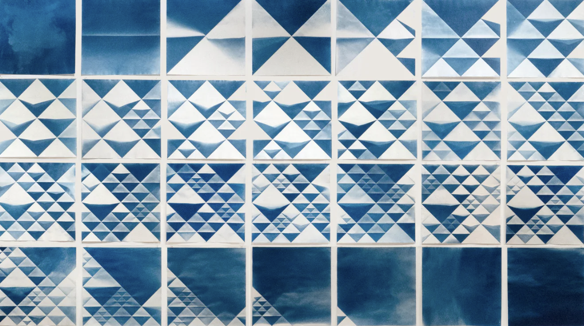 Horstman’s Folded Cyanotypes series transforms two-dimensional paper into evocative pieces that carry the memory of light, three-dimensional forms, and manual manipulation. Created by folding cyanotype-coated paper, exposing it to sunlight, and then flattening it, these works reveal a striking contrast: areas touched by light develop into vivid blue, while untouched sections remain white. They are, at once, sculptures, prints, and drawings, that also continue the tradition of camera-less photography. Horstman considers them two-dimensional artifacts of a three-dimensional gesture. Included in the exhibition is a just-finished portfolio entitled Folded Cyanotypes Progression, comprising 28 individual Folded Cyanotypes, each differing by one fold with the paper on either side of it. Hung as a grid, Horstman has also sequenced them as an animation.