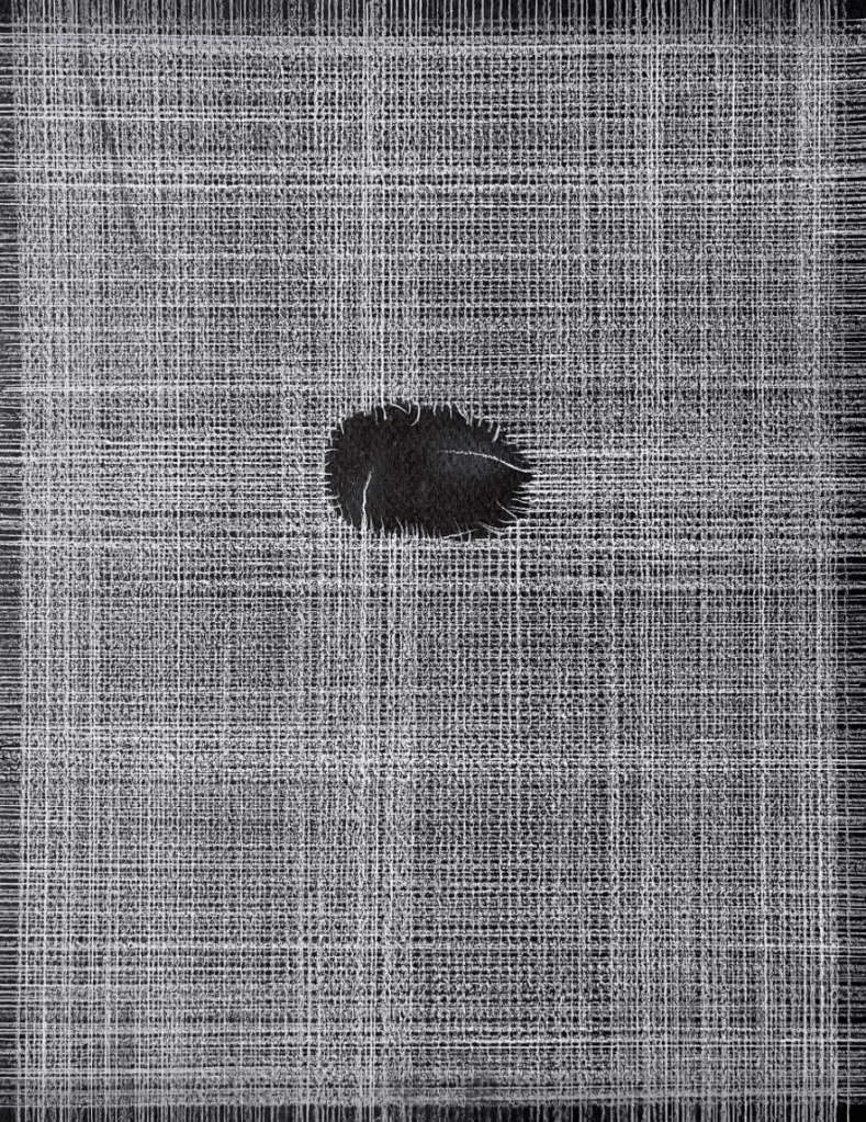 The drawings in this exhibition represent another form of assembly: line by line, strand by strand, they gradually form a collective of threads. The act of drawing—of witnessing—restores strength, even when threadbare patches and tears threaten stability. This process is akin to weaving: each line helps create a community, and their alignment suggests the idea of fabric. They “open a sentence,” as Sheila Hicks puts it. Duffy uses tailor’s pencil, dressmaker’s chalk, and graphite on cotton rag paper—tools connected to garment making—to emphasize how phenomena mirror one another, serving as a reminder to remain aware and to avoid forgetting.